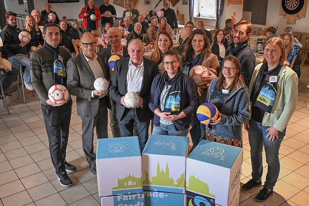 Bei der Ballproduktion liegt aus Sicht der fairen Produktion und des Arbeitsschutzes tatsächlich einiges im Argen: So werden etwa 75 Prozent aller Fußbälle weltweit in Pakistan produziert, oft unter menschenunwürdigen Bedingungen. „Wir haben das als Stadt zum Anlass genommen, gemeinsam mit der Sparkasse Fulda als Sponsor einen Ball ins Rollen zu bringen, der das Augenmerk auf die Möglichkeiten richtet, wie auch Vereine hier einen Beitrag zum fairen Handel mit Sportgeräten leisten können“, sagte der Bürgermeister. 100 fair produzierte Bälle wurden über die „Firma Bad Boyz Ballfabrik“ beschafft, die in Pakistan mit Fairtrade-zertifizierten Herstellern zusammenarbeitet. Sportvereine der Region konnten sich für einen „Fairen Ball“ bewerben, den sie im Paket mit vielen Informationen rund um das Thema Fairtrade vor Kurzem im Vereinsheim des FSV Germania Fulda überreicht bekamen. „Diese Bälle stehen nicht nur für sportliche Aktivität, sondern auch für Verantwortung und globale Solidarität“, so Wehner.