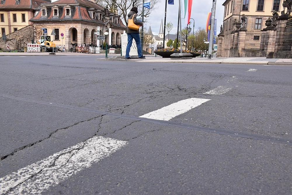 FULDA, 26.03.2026: Schon seit einiger Zeit sind die Straßenschäden und Schlaglöcher auf der Pauluspromenade/Ecke Schlossstraße unübersehbar und für die Verkehrsteilnehmerinnen und Verkehrsteilnehmer auch spürbar – jetzt wird die Kurve vor dem Stadtschloss während der Osterferien saniert.