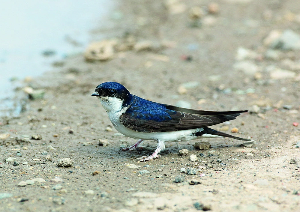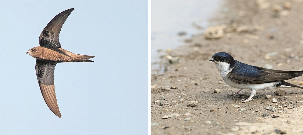Die Mehlschwalbe ist mit etwa 15 cm etwas kleiner und deutlich kontrastreicher gefärbt: Ihre Unterseite und der Bürzel sind reinweiß, Kopf und Rücken schimmern metallisch blau, die Flügel und Schwanz sind dunkel. Sie zeigt ein typisches, flatterndes Flugbild und tritt meist in Kolonien auf – sowohl zur Brutzeit als auch außerhalb.