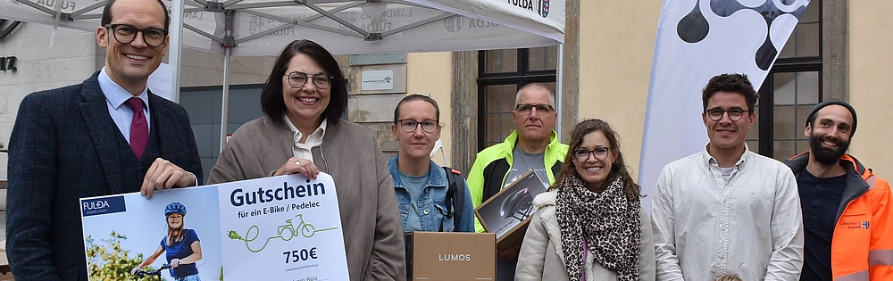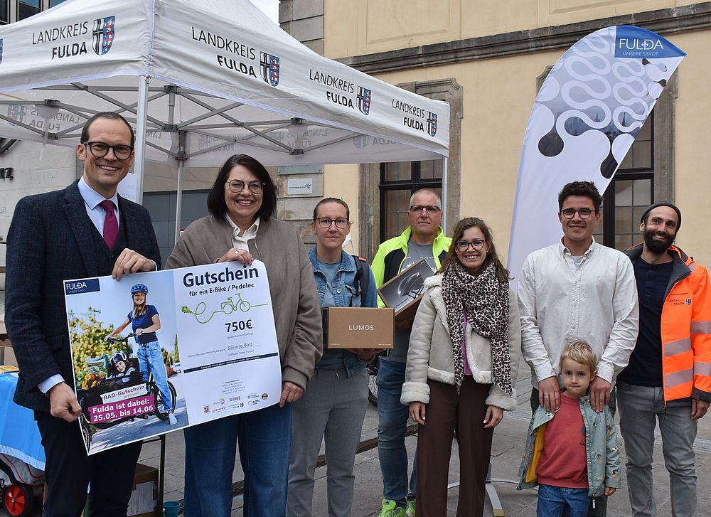 Wie immer hatten auch diesmal alle Teilnehmerinnen und Teilnehmer die Chance auf attraktive Preise: Das Los für den Hauptgewinn (einen 750-Euro-Gutschein für ein Fahrrad oder Zubehör) fiel diesmal auf Solvejg Bolz aus Schmalnau, die für das Team „Biking UTHs“ an den Start gegangen war. Zwei weitere Preise (moderne Fahrradhelme, gesponsert vom Unternehmen BioBreadness) gingen an Luca-Marie Engel aus Neuhof (Team „Flowerpower 2.0“) und an Christoph Böse aus Edelzell (Team Stadtverwaltung Fulda). Bei der Preisverleihung am Rande der „Cargobike-Roadshow“ auf dem Universitätsplatz gratulierten den Preisträgern neben Stadtbaurat Schreiner auch Christian Hillenbrand, Nahmobilitäts-Koordinator beim Landkreis Fulda, Stephan Fehrenbach, Mobilitätsmanager der Stadt Fulda, sowie Magdalena Senftleben vom Sponsor BioBreadness.