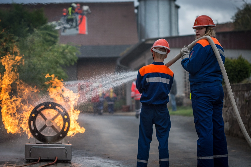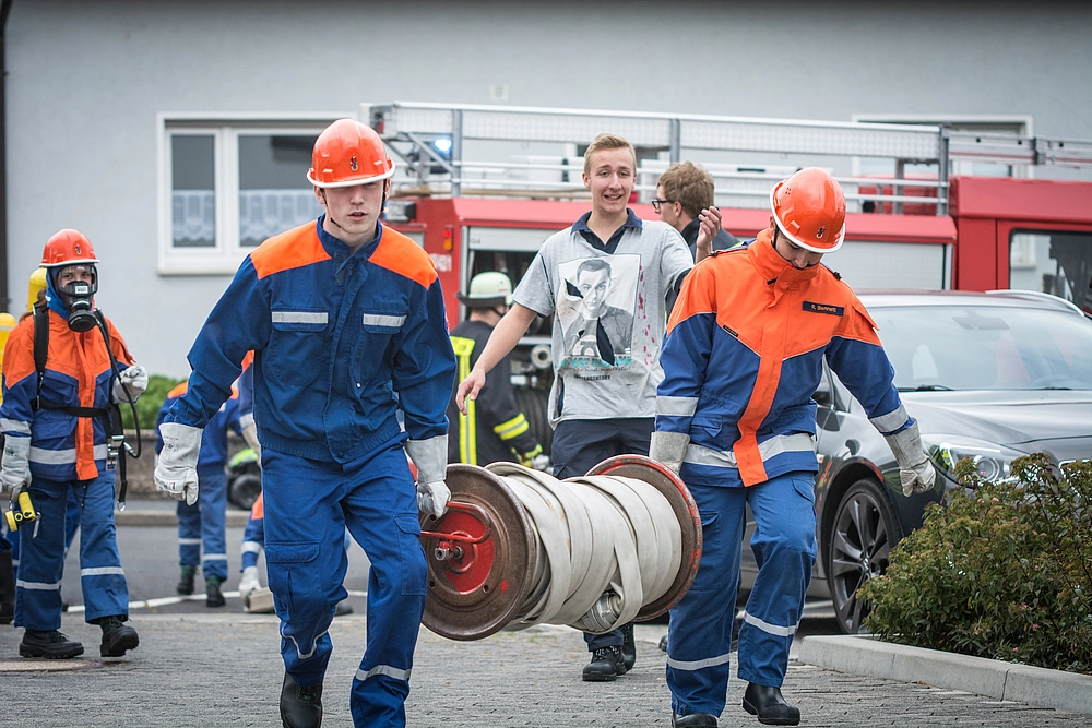 Das Highlight des Tages war allerdings die Großübung auf einem Bauernhof in Zirkenbach. Bei einem angenommenen Brand der Maschinenhalle galt es die angrenzenden Gebäudeteile abzuschirmen. Des Weiteren wurden sechs Personen in der brennenden Maschinenhalle vermisst. Die Jugendlichen hat-ten hier die Aufgabe eine Wasserversorgung herzustellen, den Brand zu löschen und die verletzten Kinder zu versorgen. Die eingeladenen Familien der Kinder sowie Oberbürgermeister Dr. Heiko Wingenfeld, Leiter der Feu-erwehr Thomas Helmer, Stadtrat Michael Ruppel, Sprecher der ehrenamtlichen Kräfte Michael Assenmacher und auch die Ortsvorsteher aus dem Kirchspiel Johannesberg konnten sich von der guten Zusammenarbeit der Jugendlichen überzeugen. Schnell waren alle Vermissten Personen gefunden und wurden vom Jugendrotkreuz professionell versorgt.