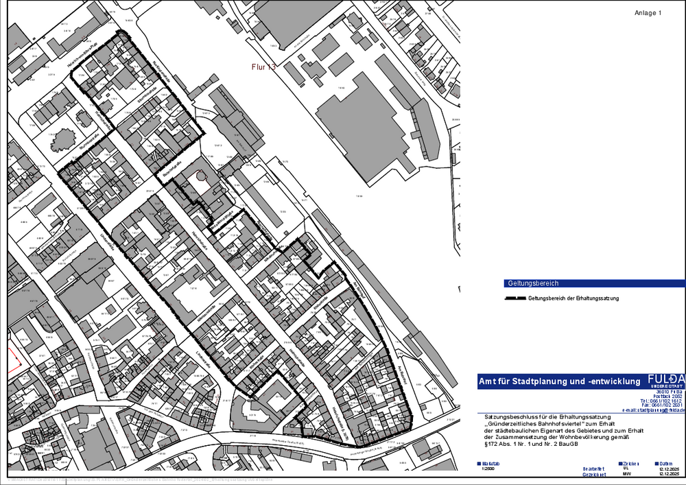 (2) Die Grenzen dieses Gebietes sind in einer Karte im Maßstab 1:2500 vom 12.12.2025 eingetragen. Die Karte ist Bestandteil dieser Satzung und kann nebst Begründung beim Magistrat der Stadt Fulda – Amt für Stadtplanung und -entwicklung – eingesehen werden.