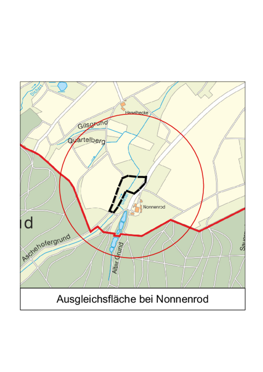 Der Geltungsbereich der externen Ausgleichsfläche bei Nonnenrod umfasst die Flurstücke 85/29, 9 und einen Teilbereich des Flurstücks 9/1 der Flur 7, das Flurstück 33/14 der Flur 6 in der Gemarkung Harmerz sowie die Flurstücke 111, 83, 84/3 und einen Teilbereich des Flurstücks 84/1 der Flur 4 in der Gemarkung Zell mit einer Gesamtfläche von etwa 2,5 ha.