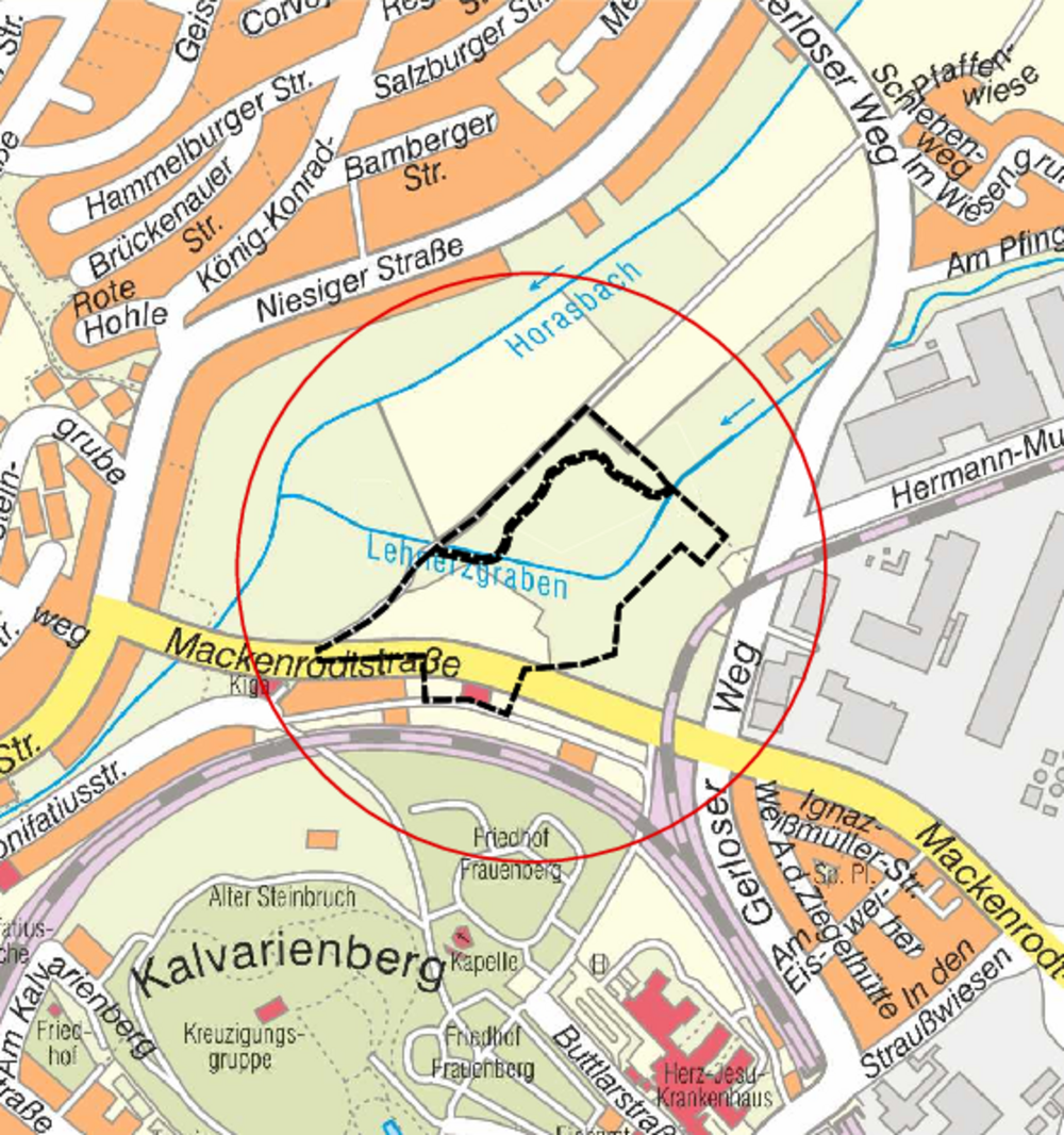 Das Plangebiet befindet sich nordwestlich der Kernstadt, getrennt durch den Frauenberg. Die Entwicklungsfläche erstreckt sich entlang der Mackenrodtstraße zwischen dem Industrie- und Gewerbegebiet Eisweiher östlich, des Horasbachtals nördlich und dem Bereich Niesiger Straße mit straßenbegleitenden Ein-, Zwei- und Mehrfamilienhäusern westlich.