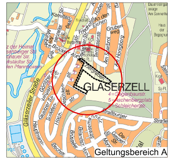 Der Geltungsbereich (A) hat eine Flächengröße von rd. 1,6 ha und umfasst in Gemarkung Gläserzell, Flur 4, die Flurstücke 66/30, 66/31, 66/32 und die Flurstücke 66/33 und 108/11 teilweise.