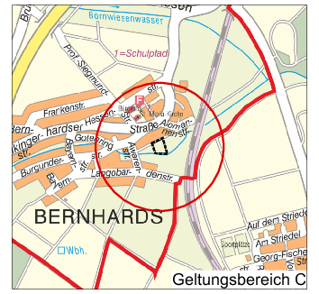 Der Geltungsbereich (C) umfasst in der Gemarkung Bernhards, Flur 3 das Flurstück 38.