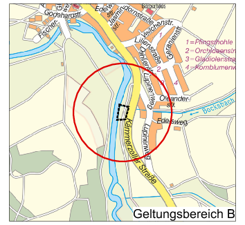 Der Geltungsbereich (B) umfasst in der Gemarkung Kämmerzell, Flur 9 die Flurstücke 4/1, 4/2 und 4/3.