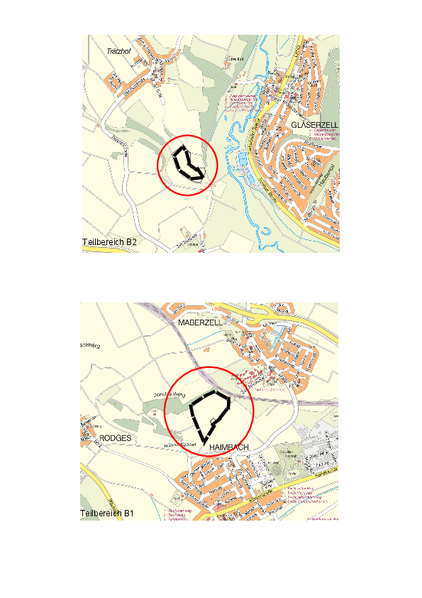 Zusätzlich wurden für die artenschutzrechtlichen Maßnahmen für die Feldlerchen folgende externe Ausgleichsflächen aufgenommen. Geltungsbereich B1: Gemarkung Maberzell, Flur 16, Flurstücke 68/1, 69/1, 1/1, 93/1, 94/1, 95/1, 96/1 und 97/1. Geltungsbereich B2: Gemarkung Maberzell, Flur 20, Flurstücke 6 und 9.