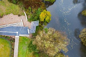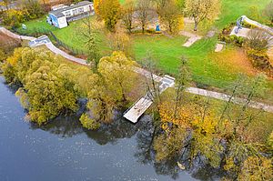 Die Breite von 2 m ermöglicht eine Fußgängerbegegnung auch mit Kinderwagen. Die Lage des Fußgängersteges wurde genau eingepasst in den vorhandenen Baumbestand, so dass kein Baum gefällt werden musste.