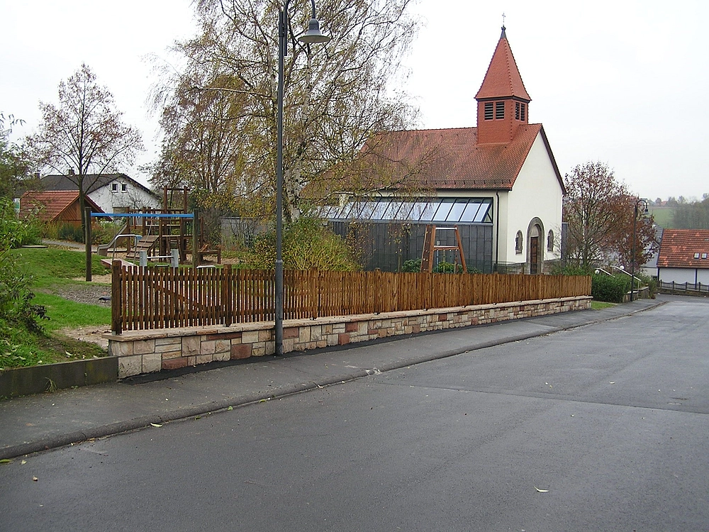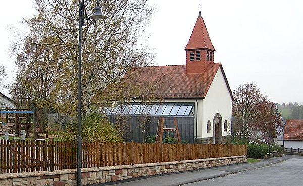Im Mai 1910 wurde der Grundstein gelegt. Alle Einwohner, so wird berichtet, wetteiferten nun mit Begeisterung durch ihre Mithilfe bei der Verwirklichung des Bauvorhabens. Sand wurde aus dem nahegelegenen Grundstücken gewonnen, die Bruchsteine kamen hauptsächlich aus dem Steinbruch nahe der Galgenbrücke. Die Steinbauarbeiten für den Sockel, die Fenster, sowie für die Türeinfassung tätigten zwei Horaser Steinmetze auf der Baustelle. Die Fuldaer Firma Leinweber fertigte die Fenster und die Schlosserarbeiten führte der ebenfalls in Fulda ansässige Schlosser Hausmann aus. Baurat Hösch entwarf die Sitzbänke und die Kommunionbank, und Damian Schmelz aus Dietershan stellte sie nach dessen Plänen her.